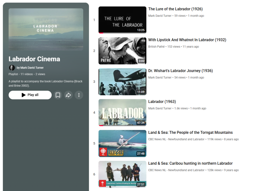 When we published Labrador Cinema in 2022, we never intended that to be our final word. Indeed we have long planned to curate and share as many of the films as we can. Now the day has come! We are launching a Labrador Cinema playlist on YouTube. This allows us a way to incorporate online material from agencies like the National Film Board of Canada, the Library of Congress, and British Pathé, all into one playlist. The YouTube platform isn’t perfect, as we would like to be able to give more commentary on the films, but we think this is a good first step in getting things together and arranging them chronologically. Now anyone interested in Labrador films will have a one-stop shop to explore what’s available for ready viewing.